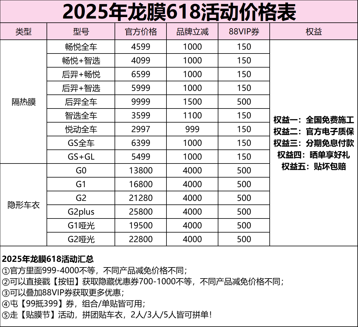 618大促是入手汽车膜的最佳时机,尤其是国际大牌龙膜,活动期间立减、满减、拼团等福利叠加,价格直降千元!但汽车膜行业素有“三分膜,七分贴”的说法,选对型号只是第一步,施工门店的技术更是关键。