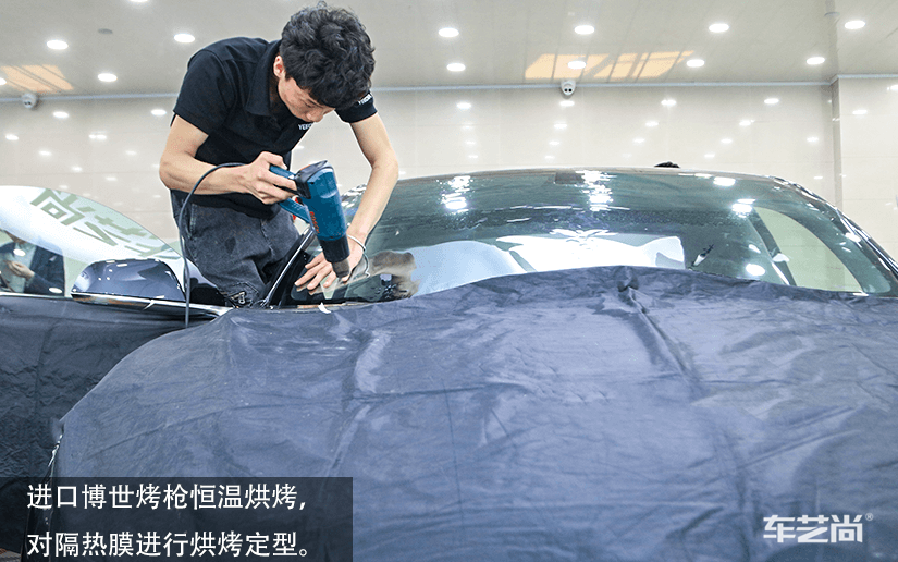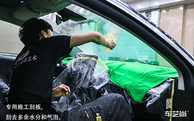 ▲汽车窗膜施工中,车艺尚采用500ML整车微水贴膜,避免电器门板受潮短路等施工伤害。