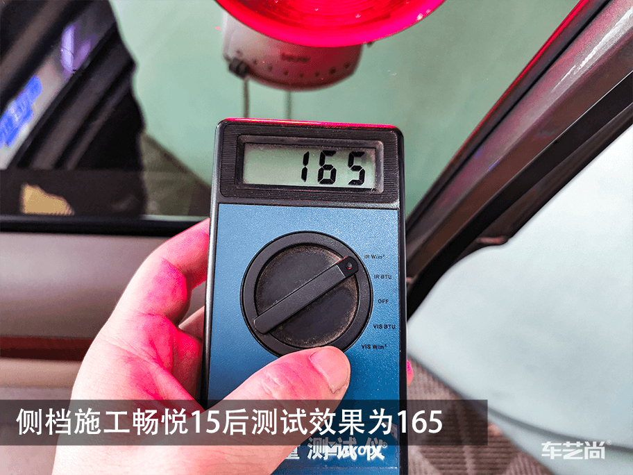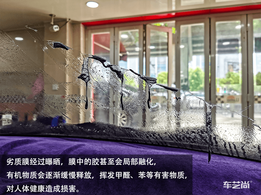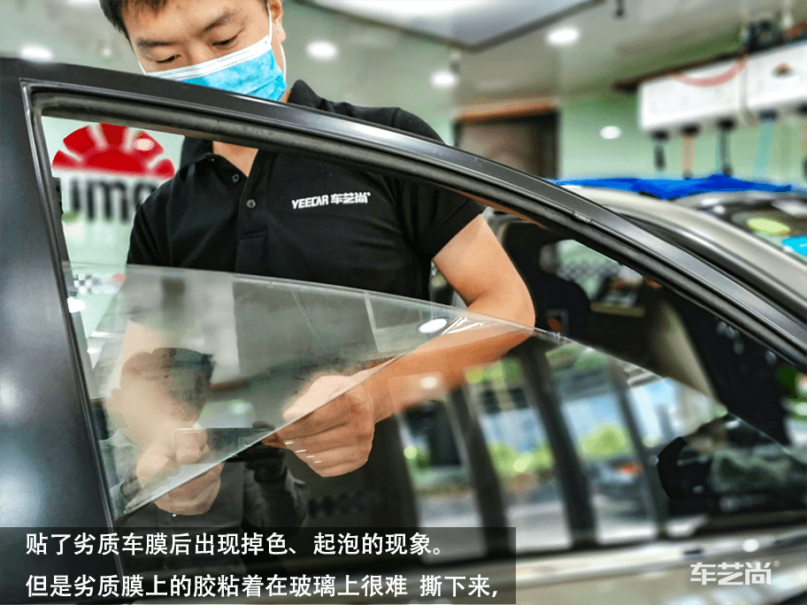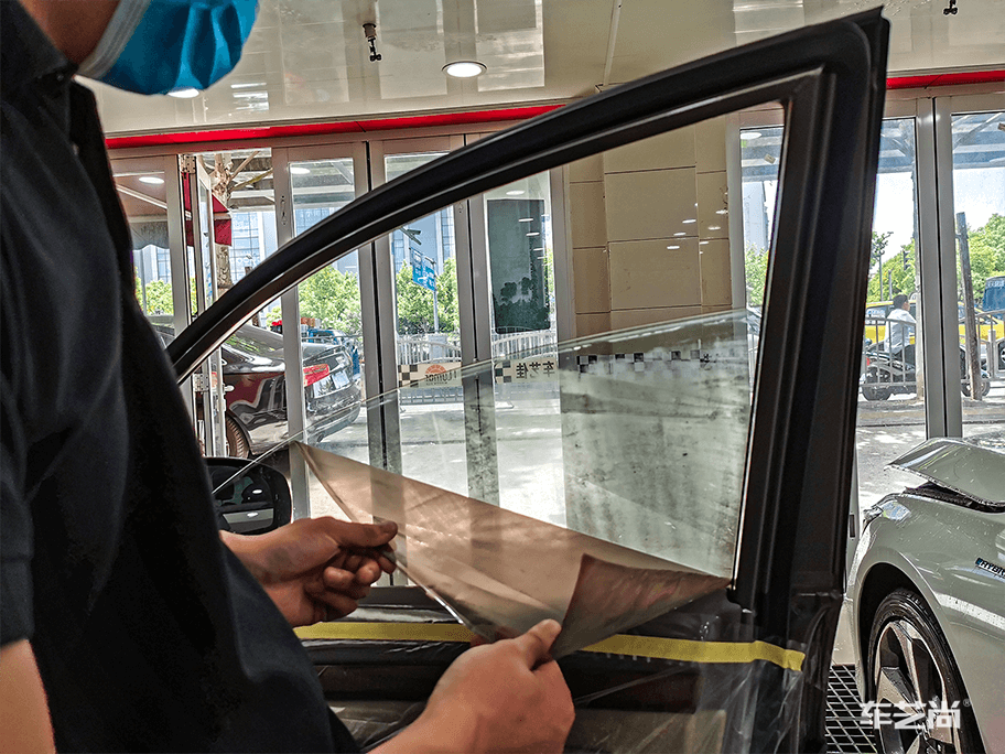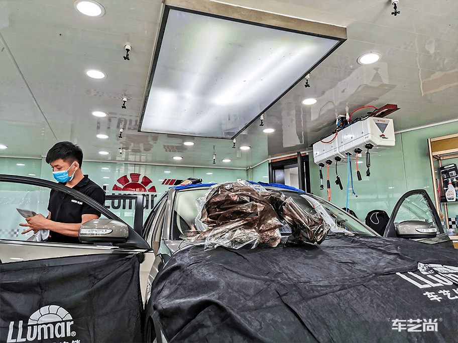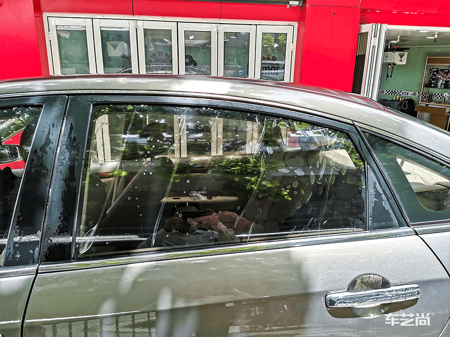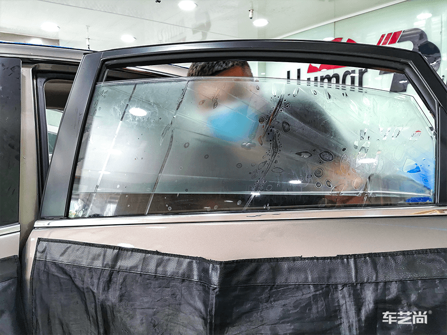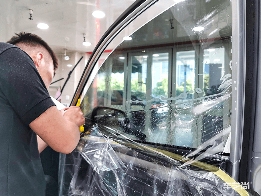 ▲汽车窗膜施工中,车艺尚采用500ML整车微水贴膜,避免电器门板受潮短路等施工伤害。