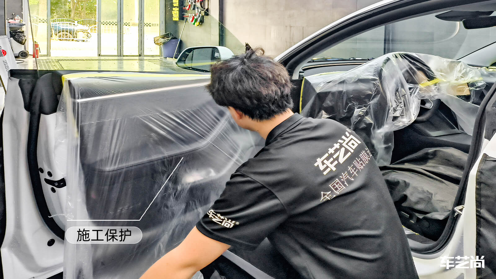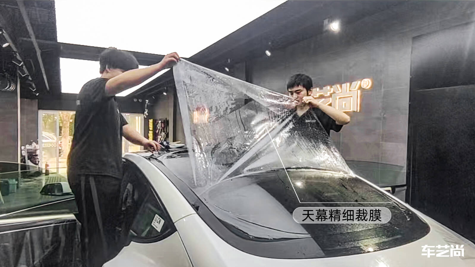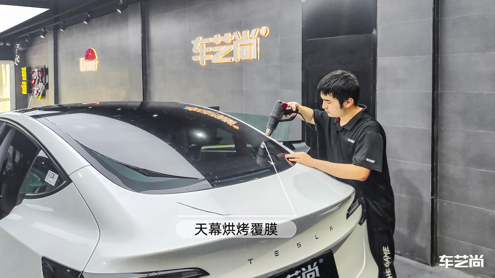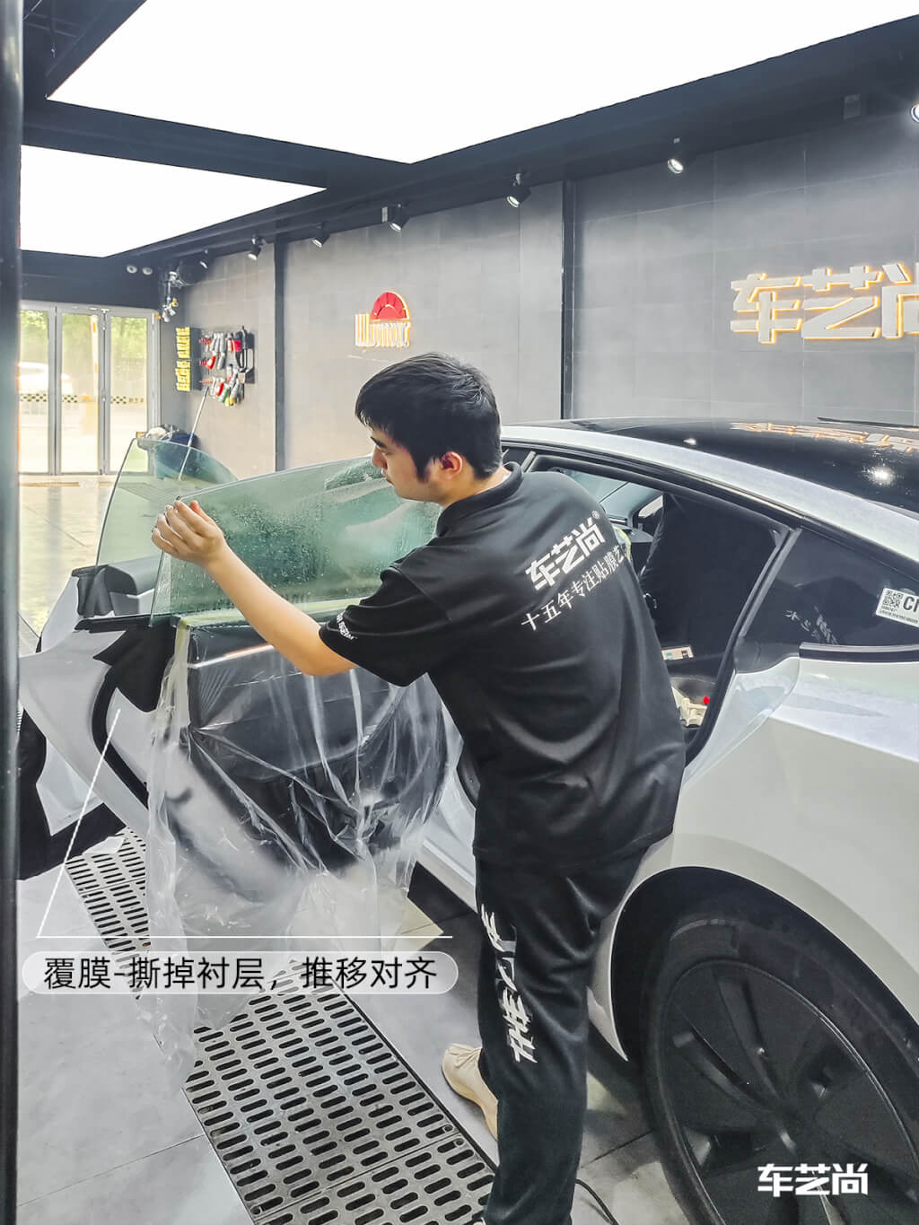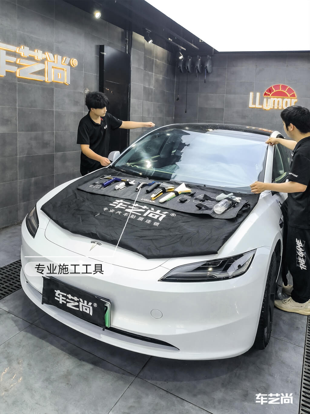 特斯拉Model 3施工龙膜前挡畅悦80+侧后挡畅悦35/15玻璃膜过程