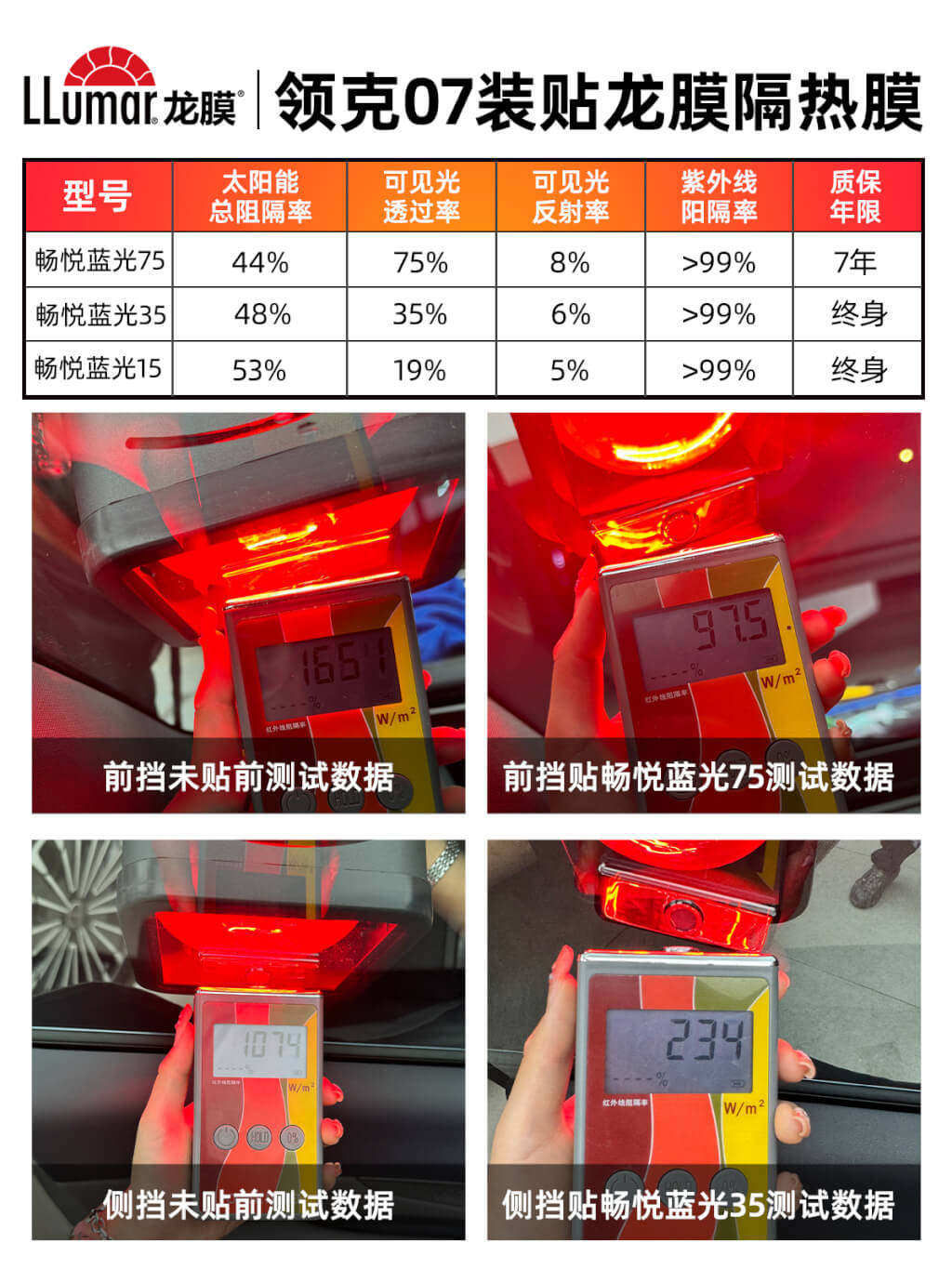 领克07施工龙膜畅悦蓝光75+畅悦蓝光35/15玻璃膜