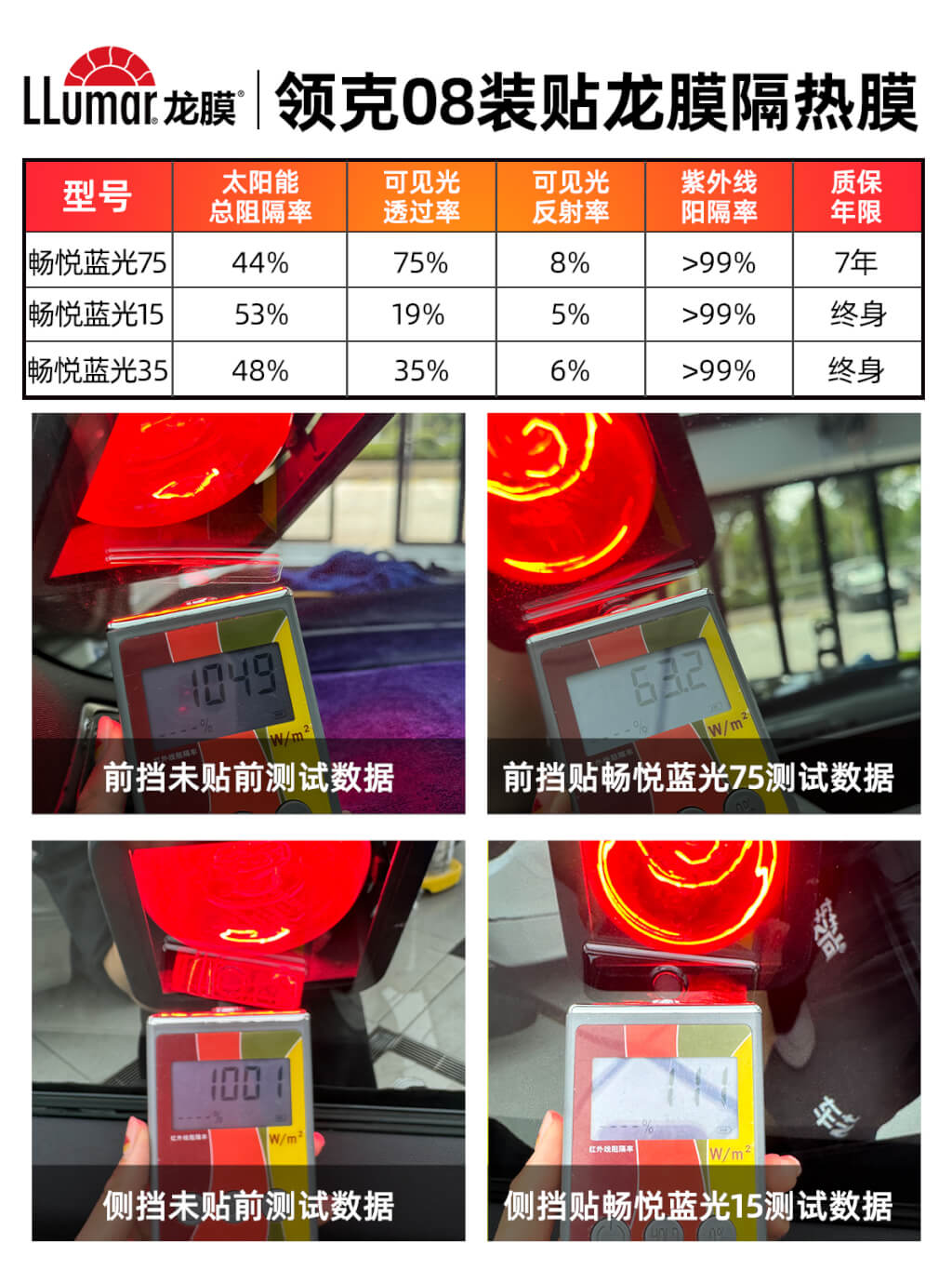 领克08施工龙膜畅悦蓝光75+畅悦蓝光35/15玻璃膜
