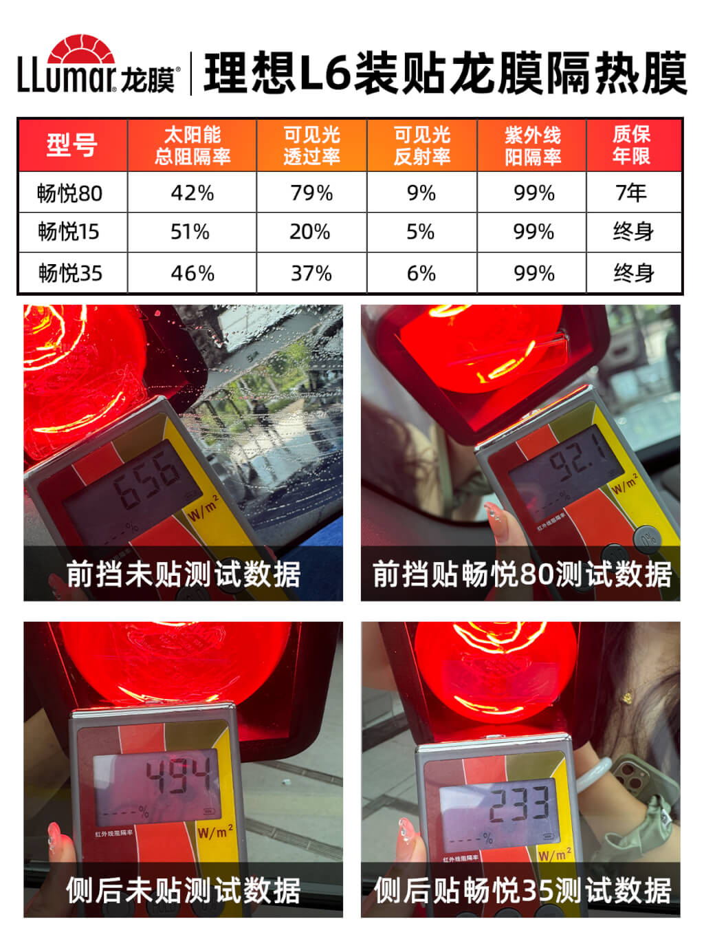 理想L6施工龙膜畅悦35/15隔热膜效果