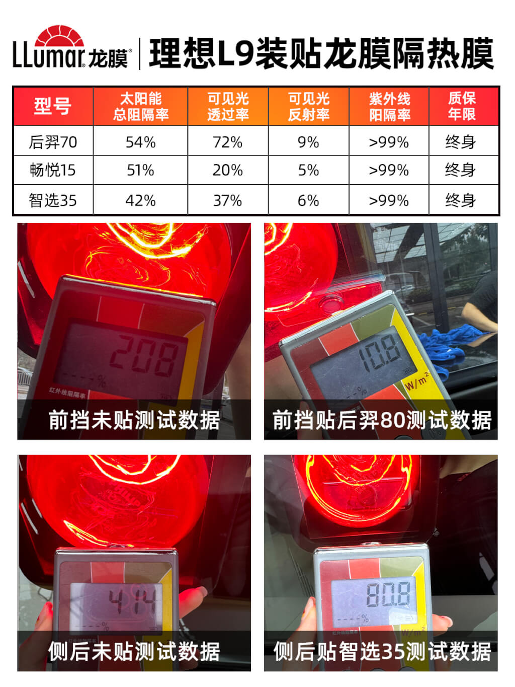 理想L9施工龙膜后羿70+畅悦35/15隔热膜