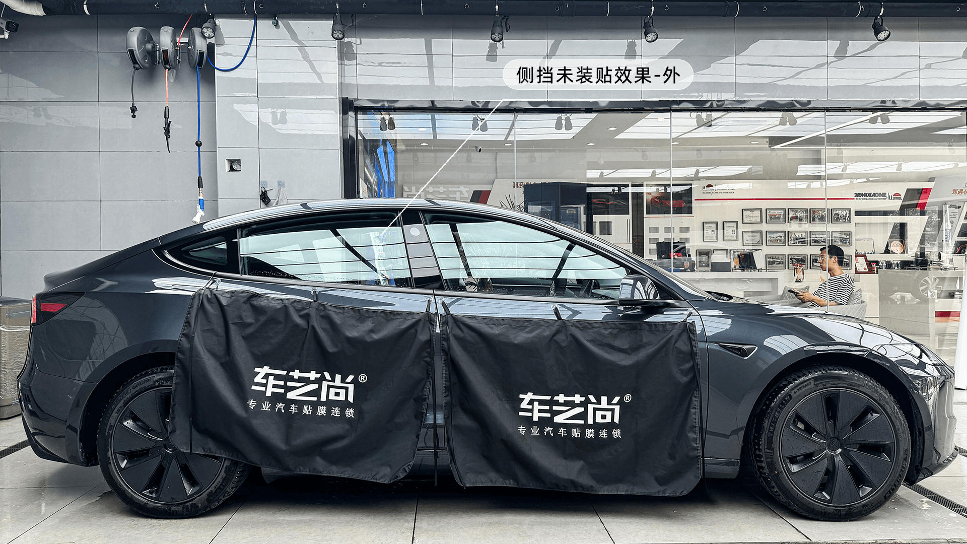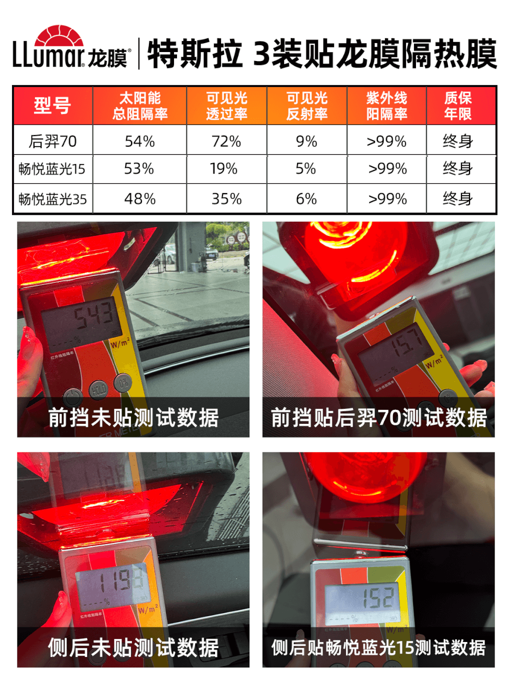 特斯拉model3施工龙膜后羿70+畅悦蓝光35/15隔热膜: