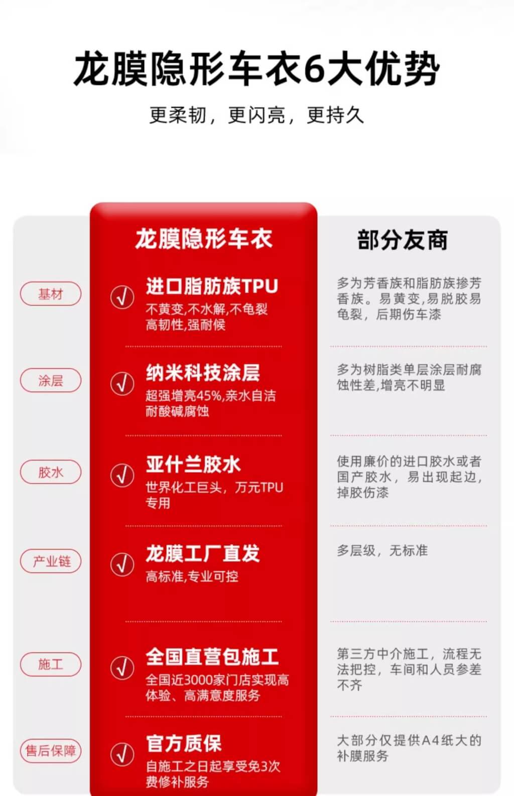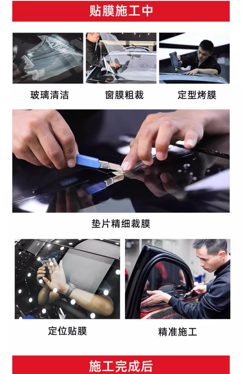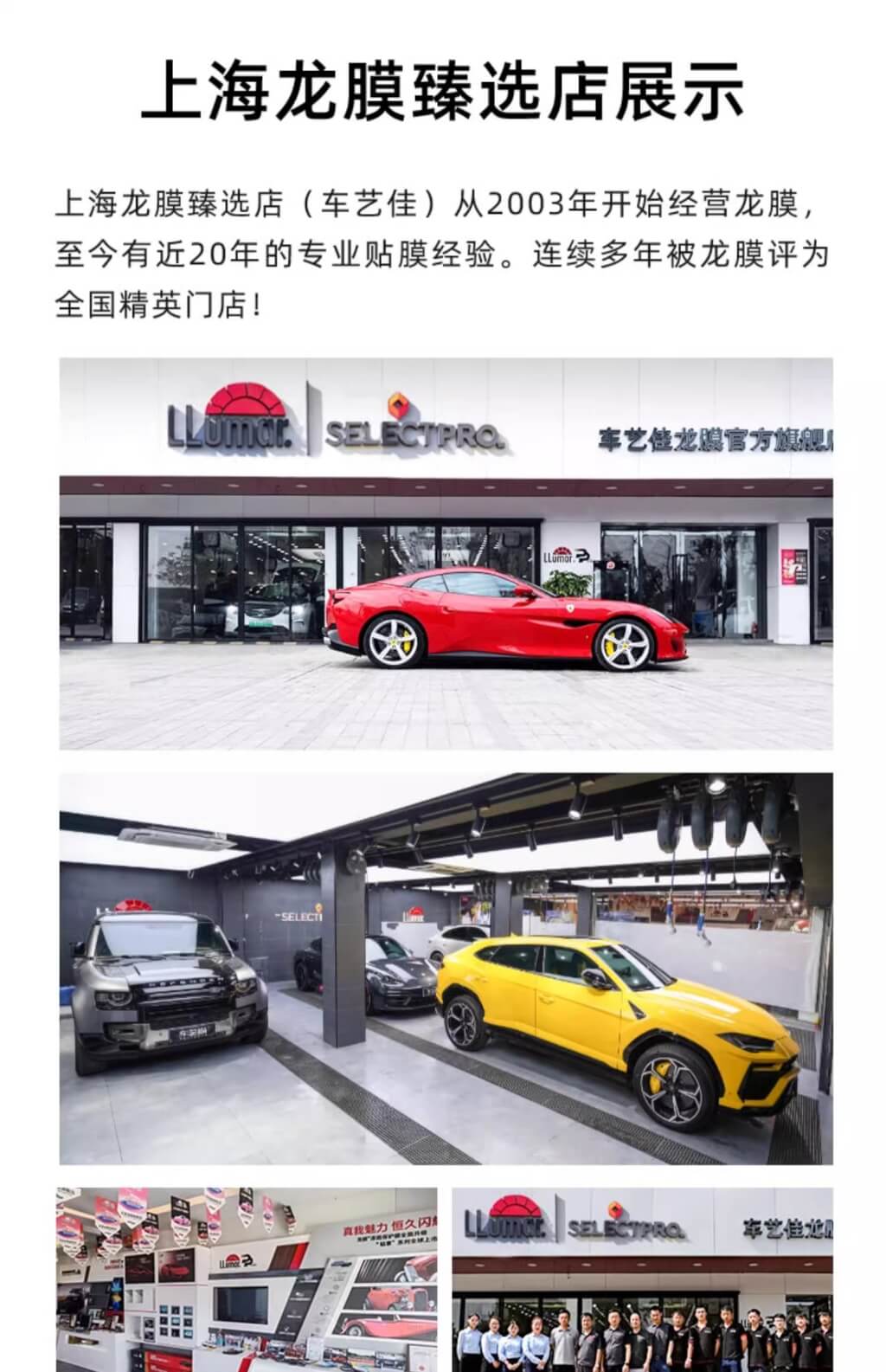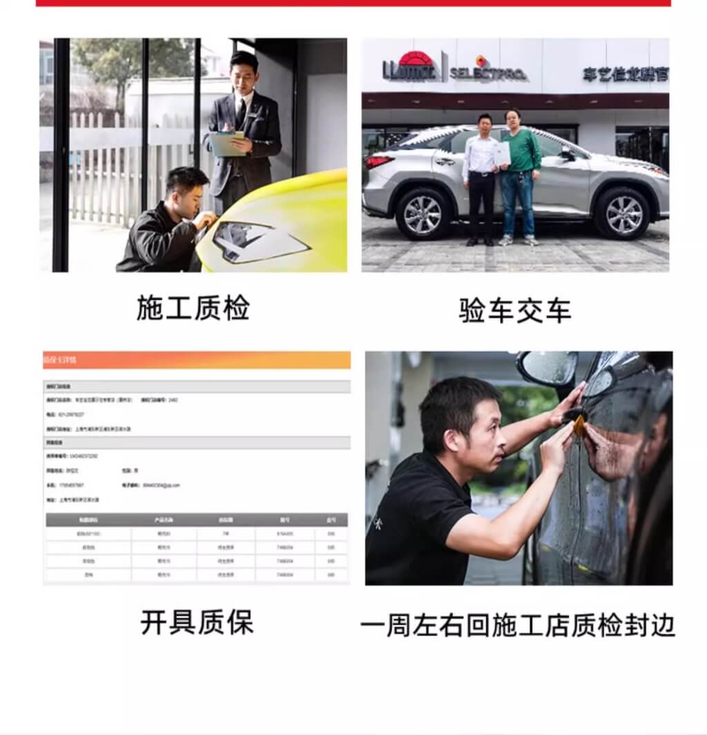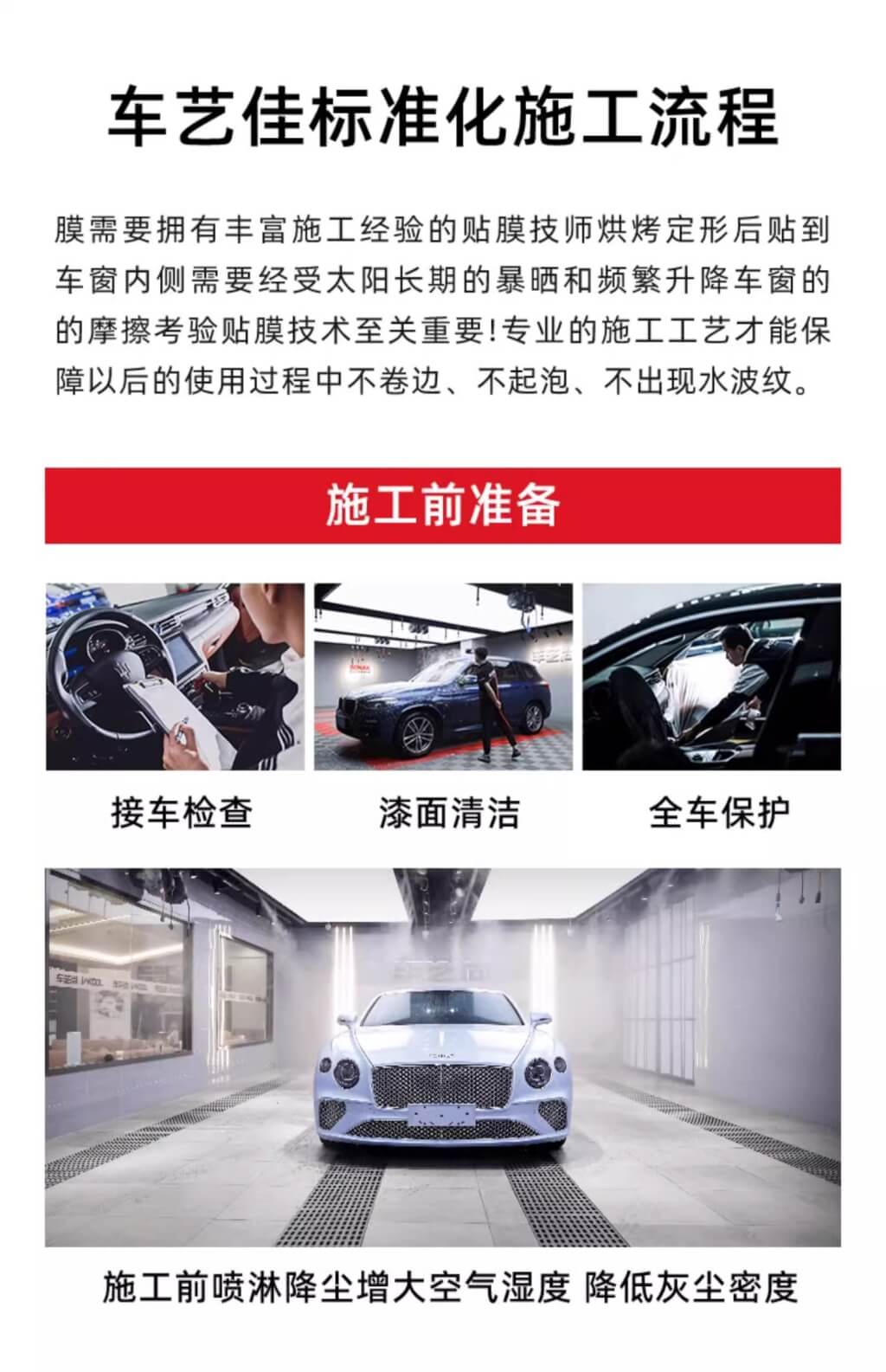 车艺佳拥有龙膜官方认证大师级技师团队,专业的无尘施工车间,完善的售前售中售后服务体系,上万辆车次的丰富施工经验。