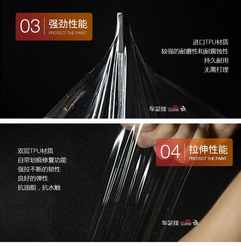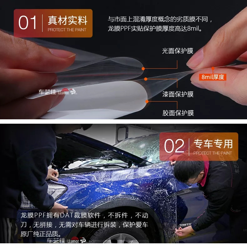 透明膜最大的作用就是保护爱车,龙膜隐形车衣不算背胶不算背纸厚度8mil,纳米涂层2.5mil,是其他品牌整体膜厚度的三分之一 ,涂层厚度的5倍,它具备超强抗腐蚀和抗剐蹭性能。