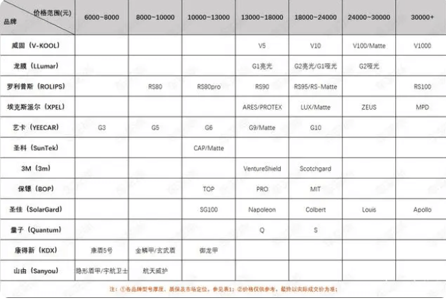 最后附上市面上常见的12个隐形车衣品牌,及其47款产品的型号、级别定位、厚度、质保年限及价格表单,拿走不谢。