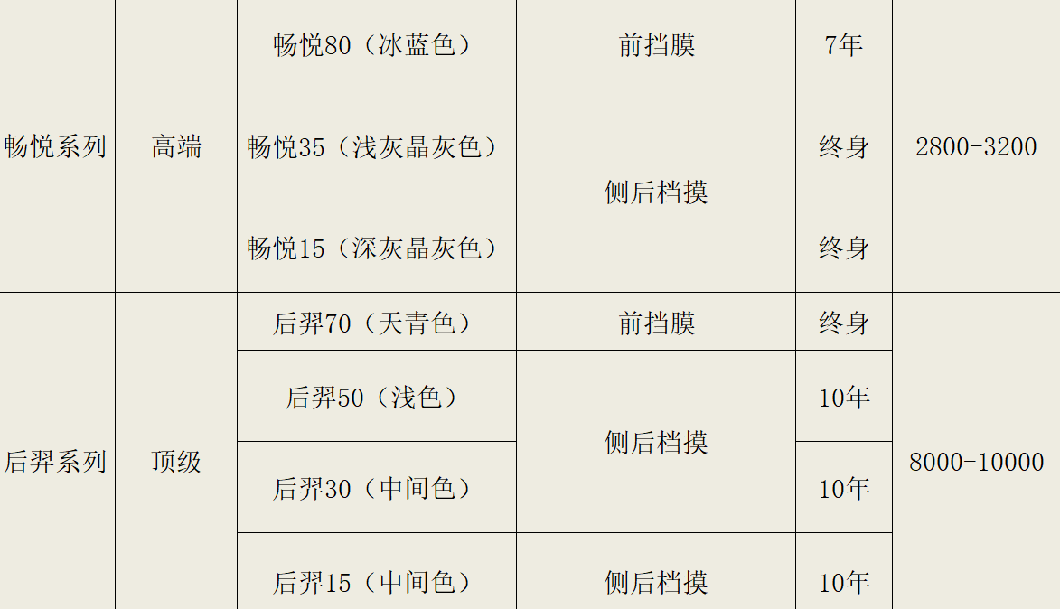 一般天窗适合贴浅色的膜,这样既能遮挡住一部分热量,汽车内也会感觉宽敞舒适。因为天窗不存隐私暴露等问题,贴一个透光率高,且总太阳能阻隔率高的在合适不过。比如龙膜的常规款畅悦80,预算充足的话,高端款后羿70。