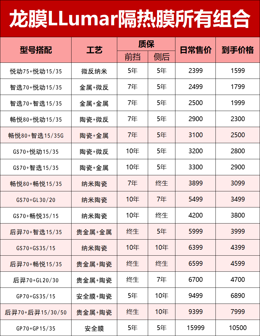龙膜汽车贴膜价格表