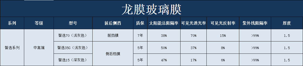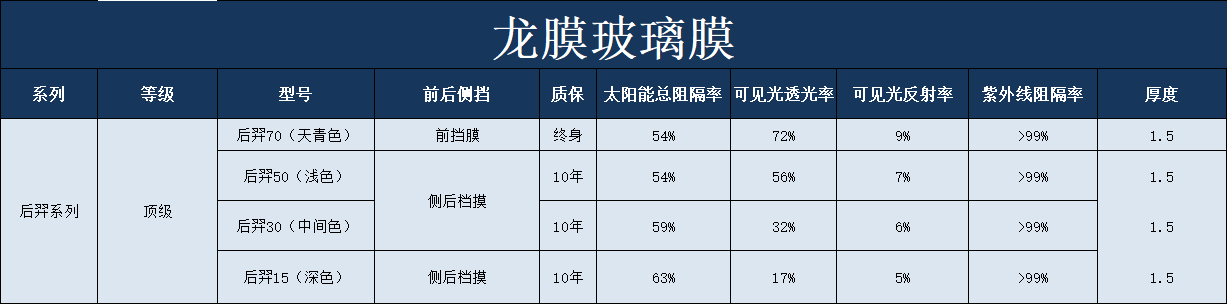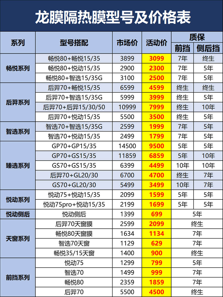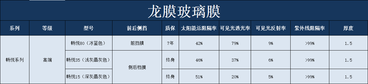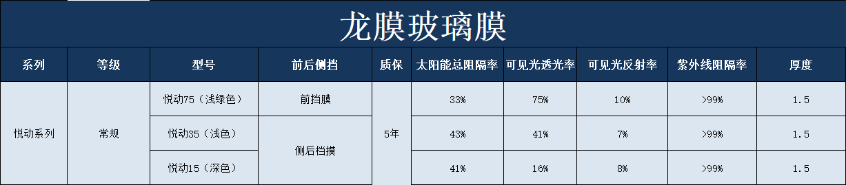 加上4s店及车企合作的玻璃膜有上百种,可是到目前销量较好的,且得到市场认可的莫过于实体店及电商型号,有龙膜悦动全车、龙膜畅悦全车、龙膜后羿全车,以及臻选店型号(GS/GL/GP等)。