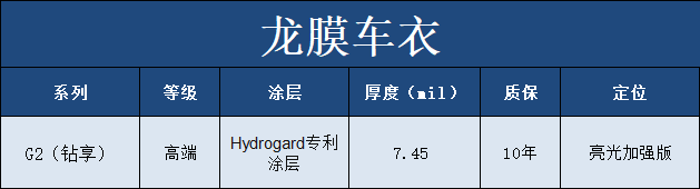 龙膜G2厚度为7.45mil,质保十年,采用全球专利的Hydroguard涂层技术,以及纳米涂层镀晶技术,抗剐蹭耐腐蚀的性能更为突出。