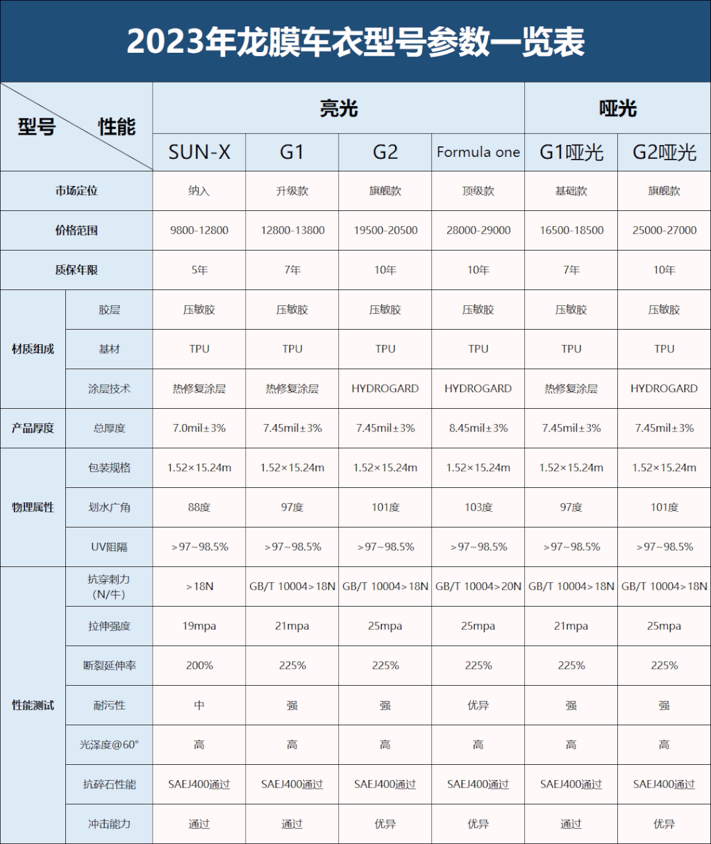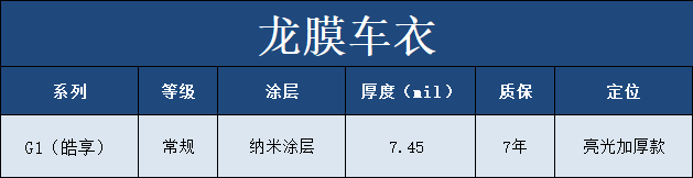 龙膜G1的隐形车衣可以质保7年,厚度均为7.45mil,材质是TPU+纳米涂层,G1虽然可以提供很好的漆面保护效果,但其亮度、疏水性、抗污能力与龙膜新一代漆面保护膜G2系列相比还有一些差距,也就是说它增加了美观效果。