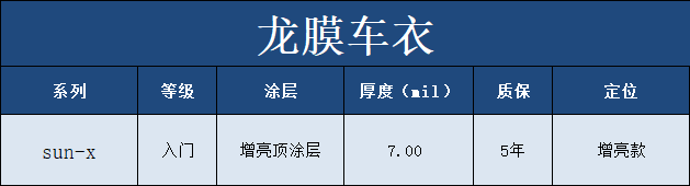 SunX,伊士曼旗下纯进口品牌,厚度7mil,质保5年,采用的热修复涂层、脂肪族TPU以及伊士曼自研压敏胶,进口车衣品牌且万元下性价比较高的一款。