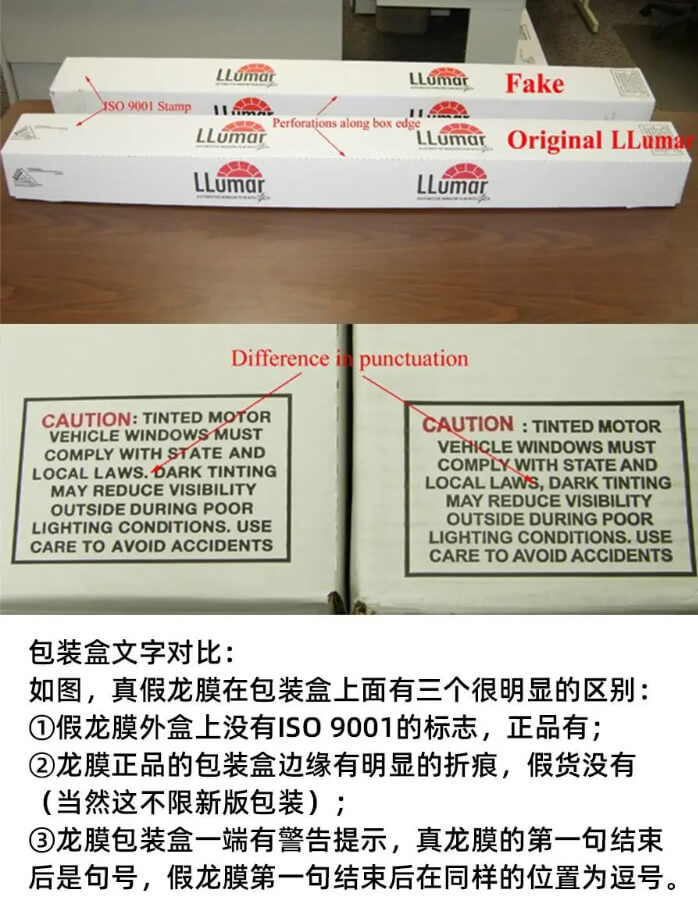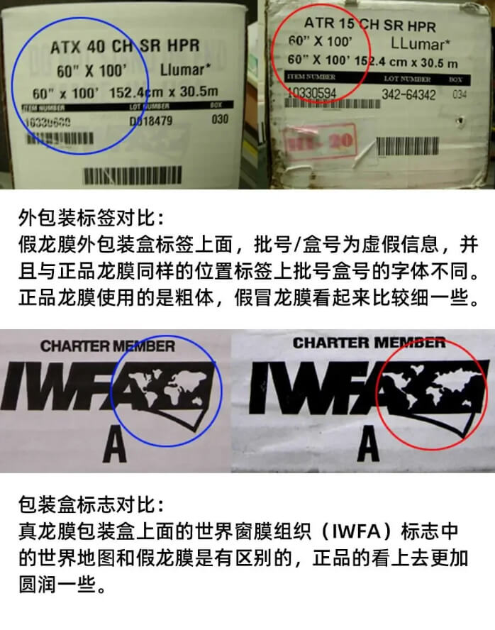 真龙膜包装盒上面的世界窗膜组织(IWFA)标志中的世界地图和假龙膜是有区别的,正品的看上去更加圆润一些。
