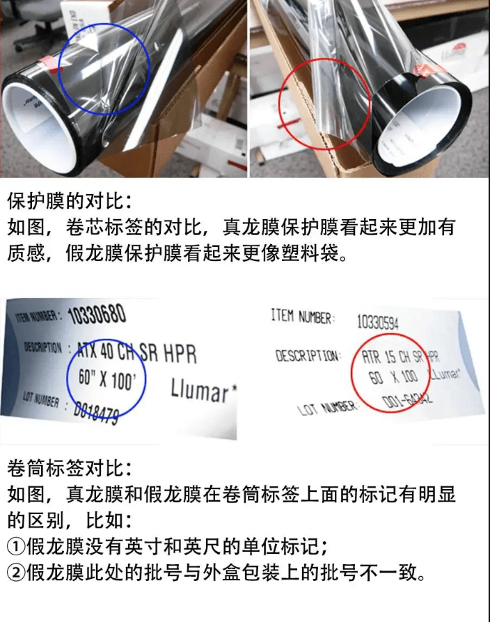 卷芯标签的对比,真龙膜保护膜看起来更加有质感,假龙膜保护膜看起来更像塑料袋。