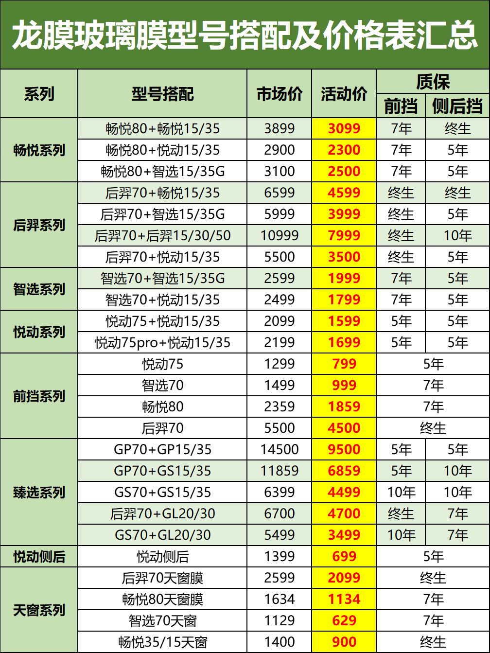 龙膜隔热膜型号众多,买了新车急于贴膜,却不知道贴那款,眼下正值龙膜畅悦活动期间,爆款畅悦全车(畅悦80+畅悦15/35),好礼送不停。详情请往下看!