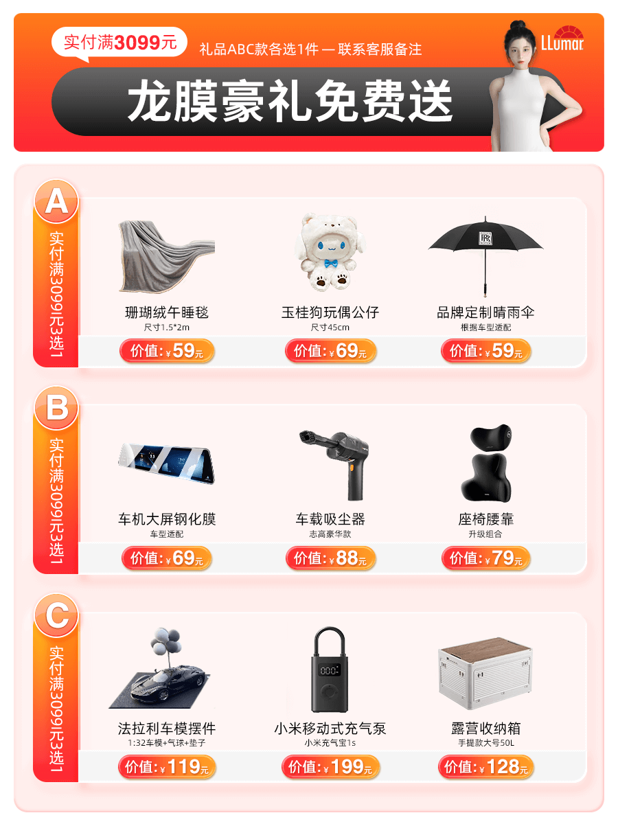 礼品B:车机大屏钢化膜、车载吸尘器、座椅腰靠(任选其一)