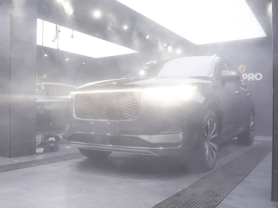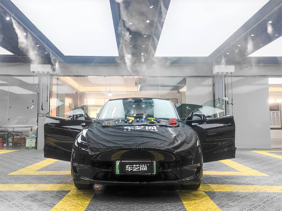 车艺尚杭州店施工环境,专业的施工车间,标配喷淋系统、雾化降尘、恒温车间,明亮射灯+无影顶灯,为贴膜提供最大限度的无死角照明,和恒温恒湿干净无尘环境,每一位贴膜师傅皆受过专业的培训,通过考核后持证上岗,平均年龄要在9年以上。