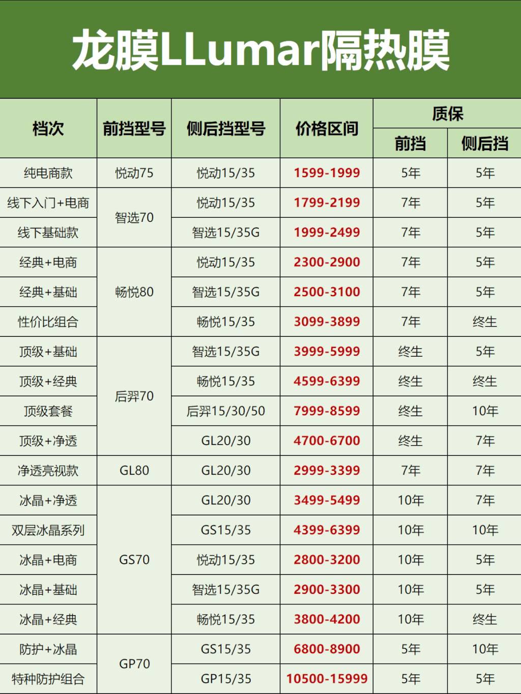 四、杭州汽车贴膜价格表(以龙膜为主)