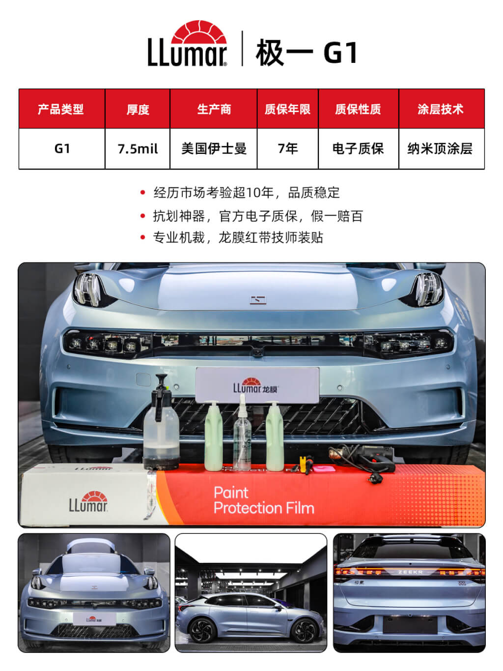 龙膜G1质保7年,厚度均为7.45mil,材质是TPU+纳米涂层,可以提供很好的漆面保护效果,光泽度很好,更美观。