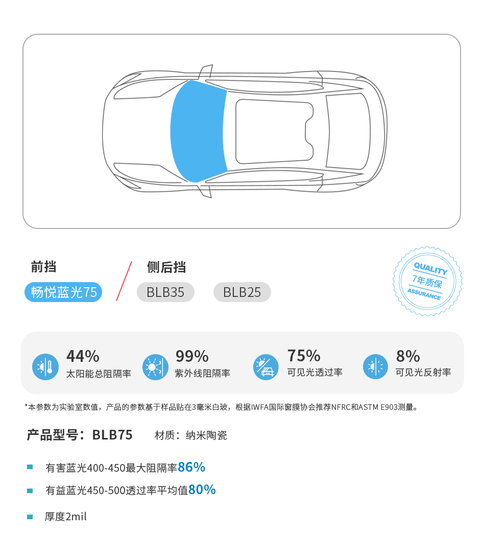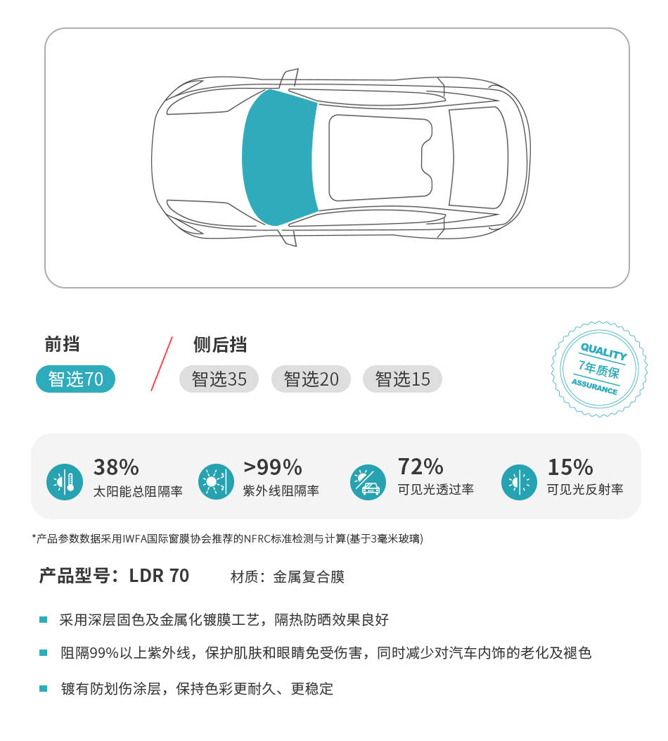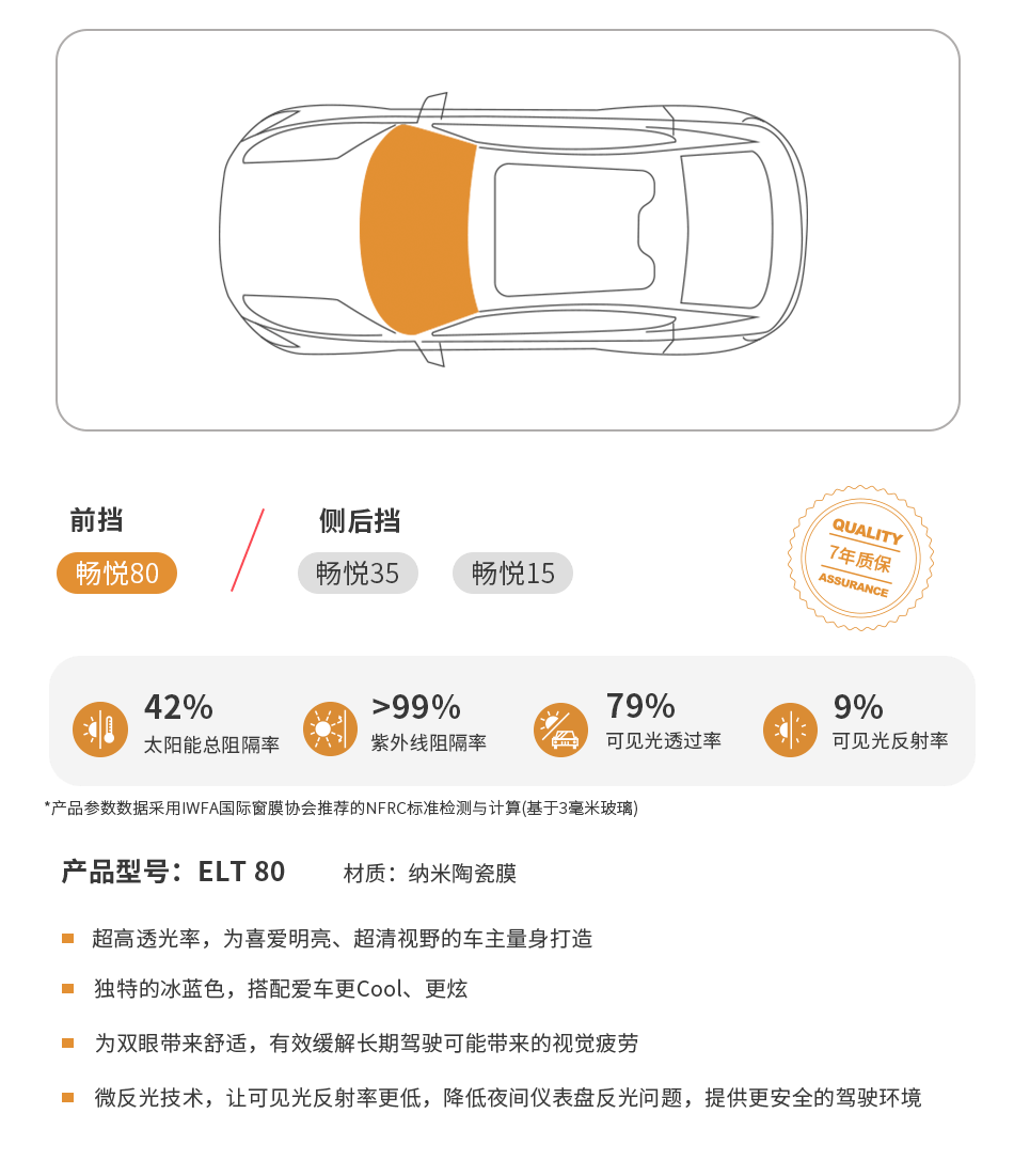 考虑透光率:透光率是关乎行车安全的重要性能。根据《中华人民共和国机动车运行安全技术条件》规定,前挡可见光透过率要大于70%。因此,尽量选择透光率高一点的隔热膜,特别是车窗膜和前排两侧窗的膜,畅悦80的透光率可达到79%。