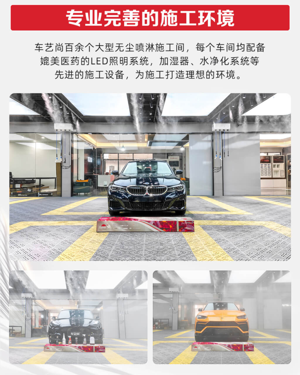 2、施工环境:专业的汽车贴膜店应具备无尘施工车间和先进的施工设备,如车艺尚西安龙膜旗舰店,确保在一个干净、无尘的环境中完成贴膜工作 。